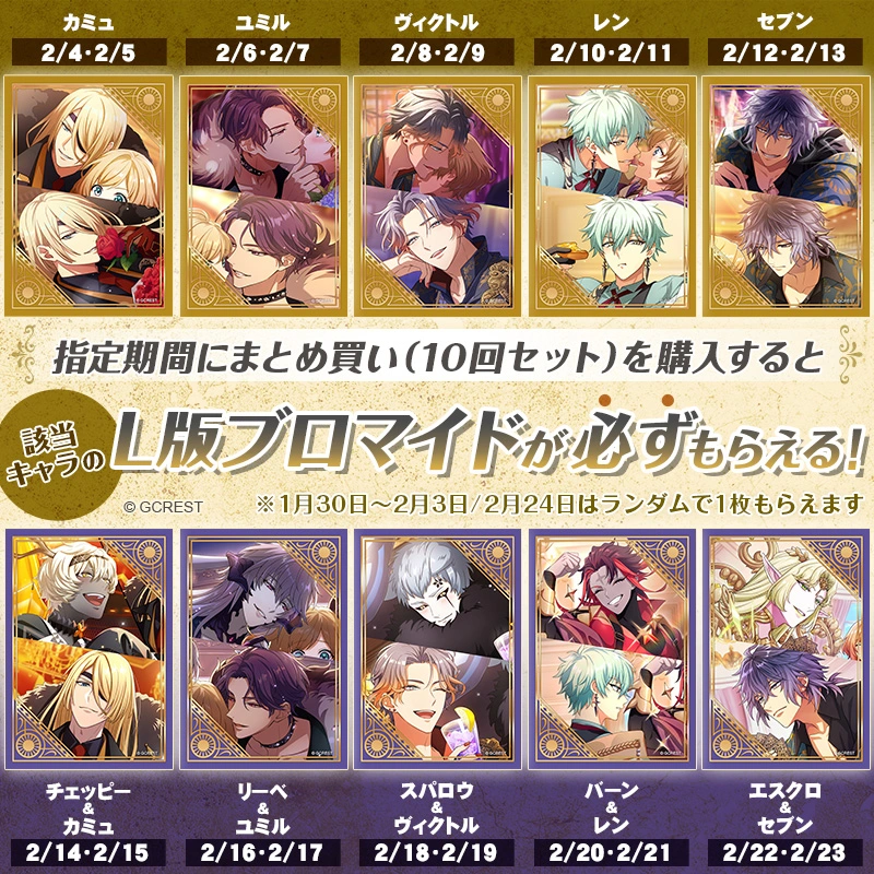 指定期間中にまとめ買い(10回セット)を購入すると必ず指定キャラのL版ブロマイドがもらえます♪