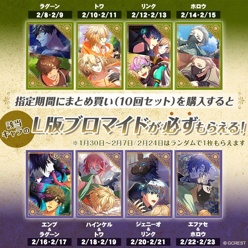 指定期間中にまとめ買い(10回セット)を購入すると必ず指定キャラのL版ブロマイドがもらえます♪