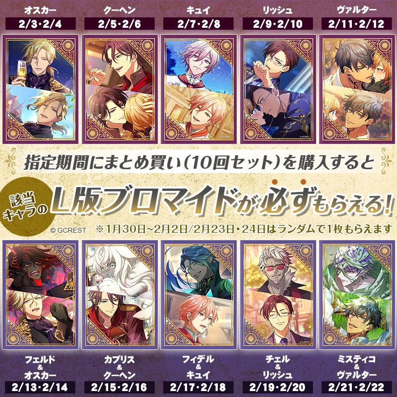 指定期間中にまとめ買い(10回セット)を購入すると必ず指定キャラのL版ブロマイドがもらえます♪