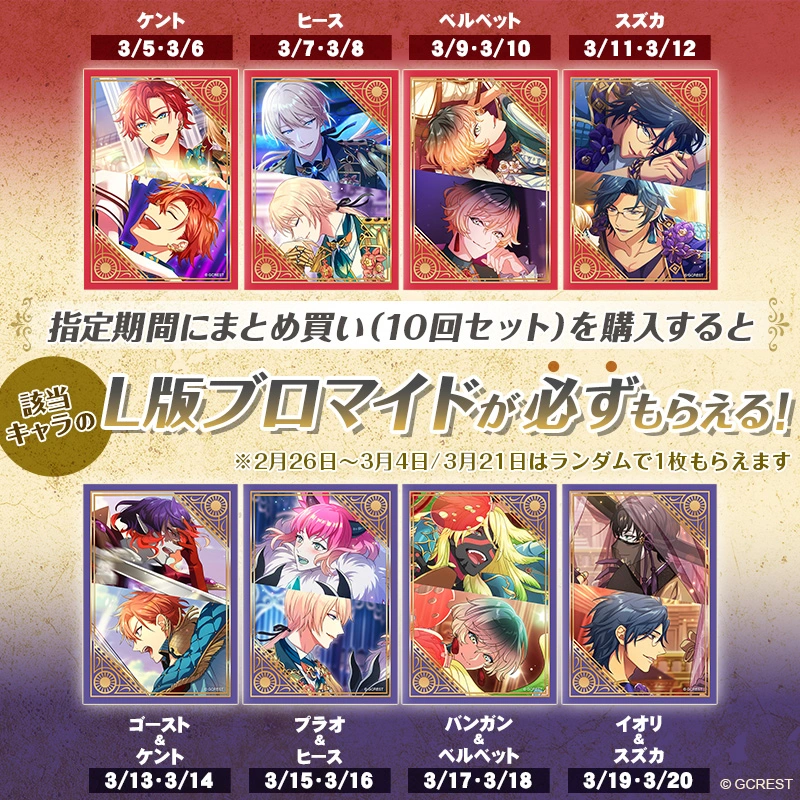 指定期間中にまとめ買い(10回セット)を購入すると必ず指定キャラのL版ブロマイドがもらえます♪
