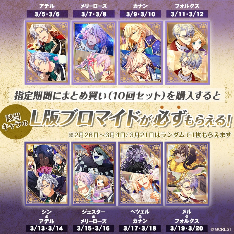 指定期間中にまとめ買い(10回セット)を購入すると必ず指定キャラのL版ブロマイドがもらえます♪
