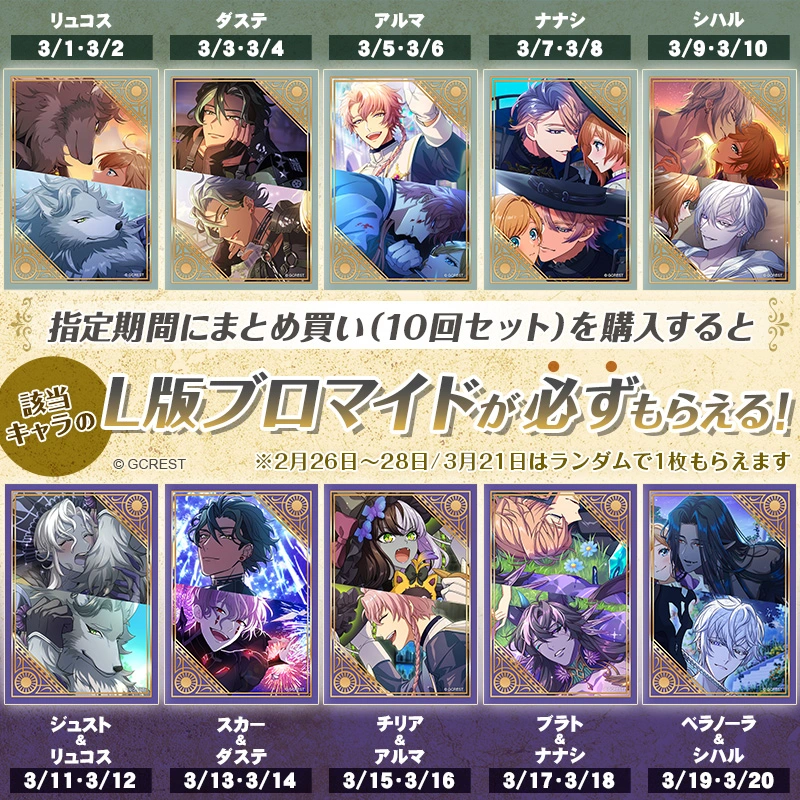 指定期間中にまとめ買い(10回セット)を購入すると必ず指定キャラのL版ブロマイドがもらえます♪