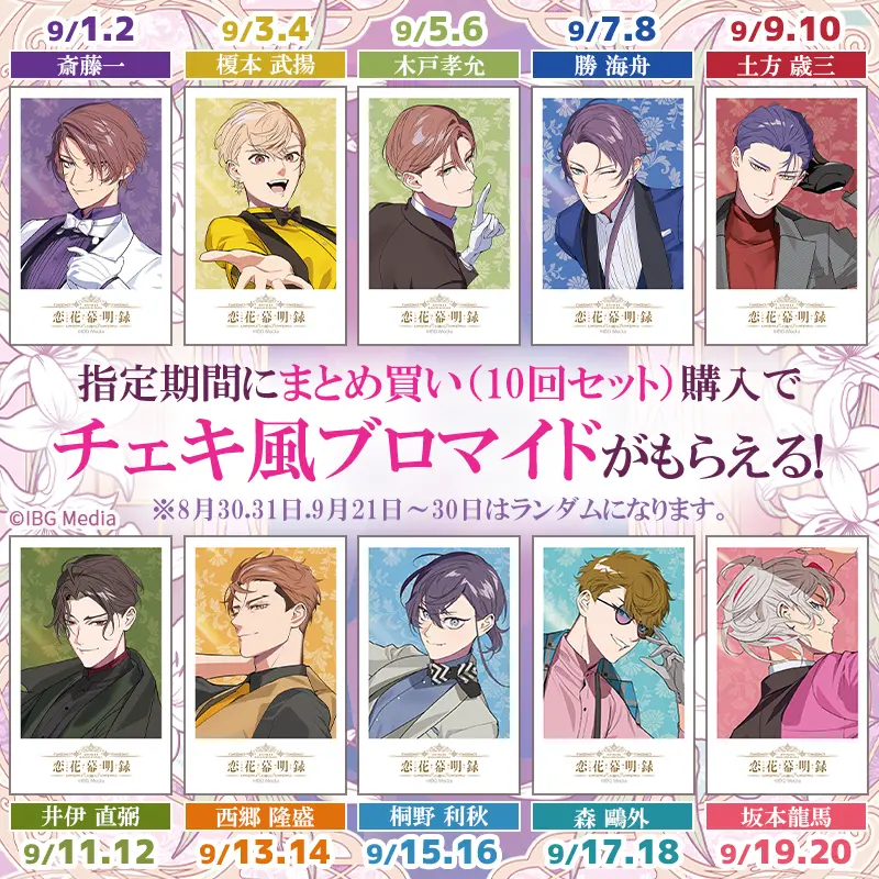 指定期間中にまとめ買い(10回セット)を購入すると必ず指定キャラのチェキサイズブロマイドがもらえます♪