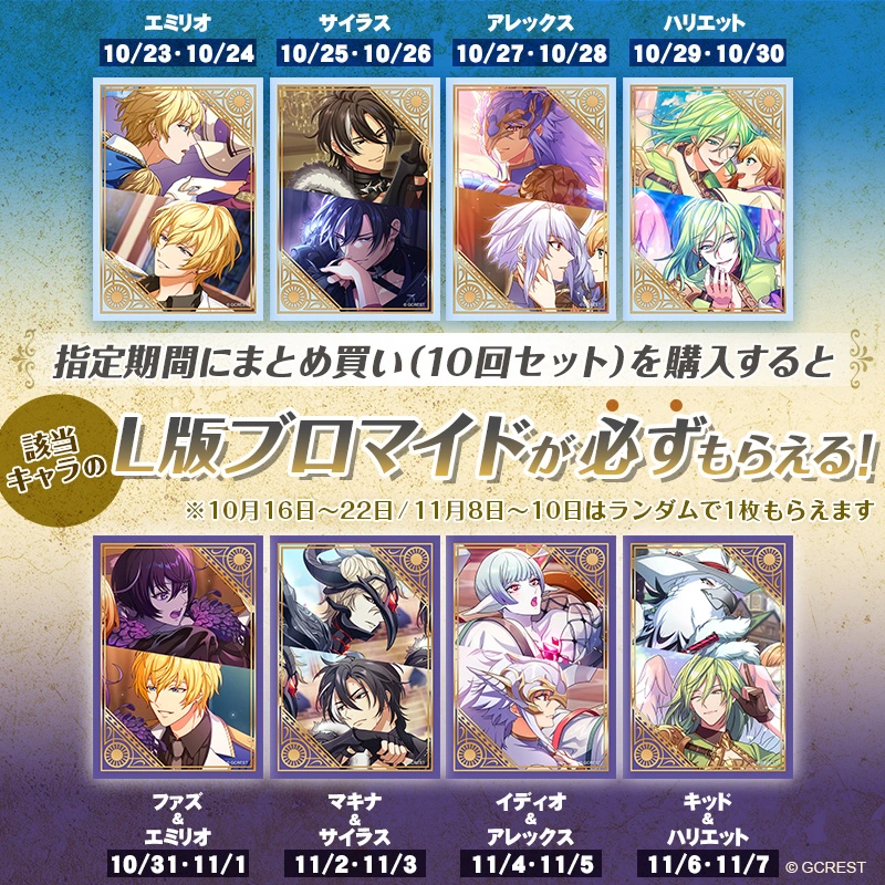 指定期間中にまとめ買い(10回セット)を購入すると必ず指定キャラのL版ブロマイドがもらえます♪