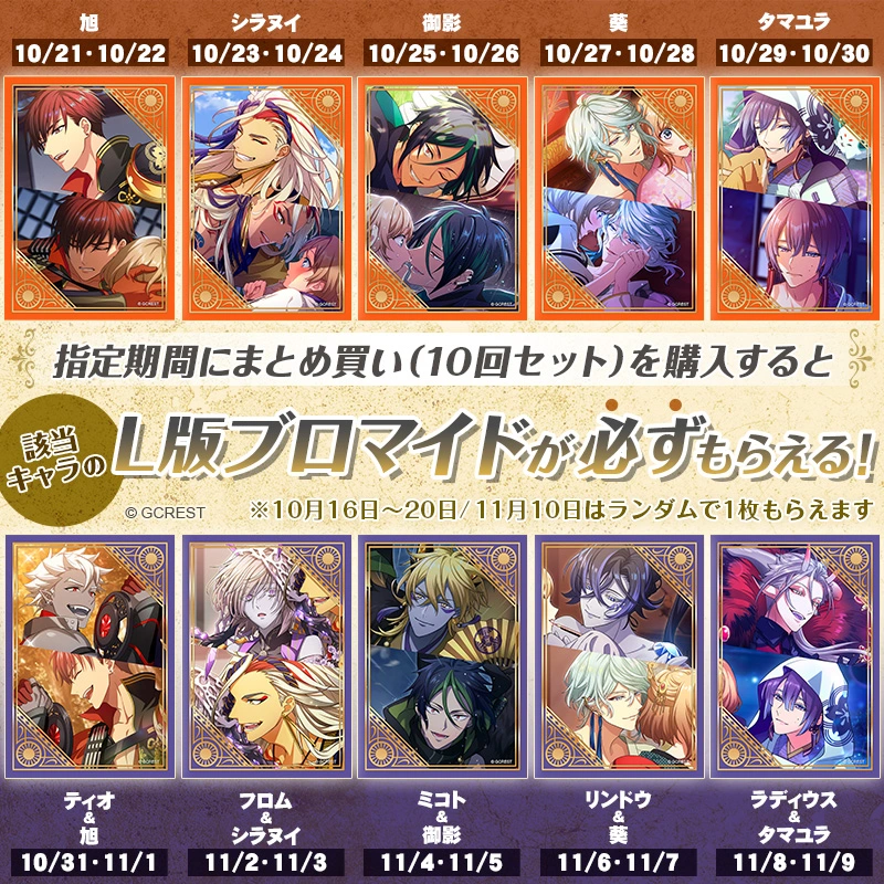 指定期間中にまとめ買い(10回セット)を購入すると必ず指定キャラのL版ブロマイドがもらえます♪